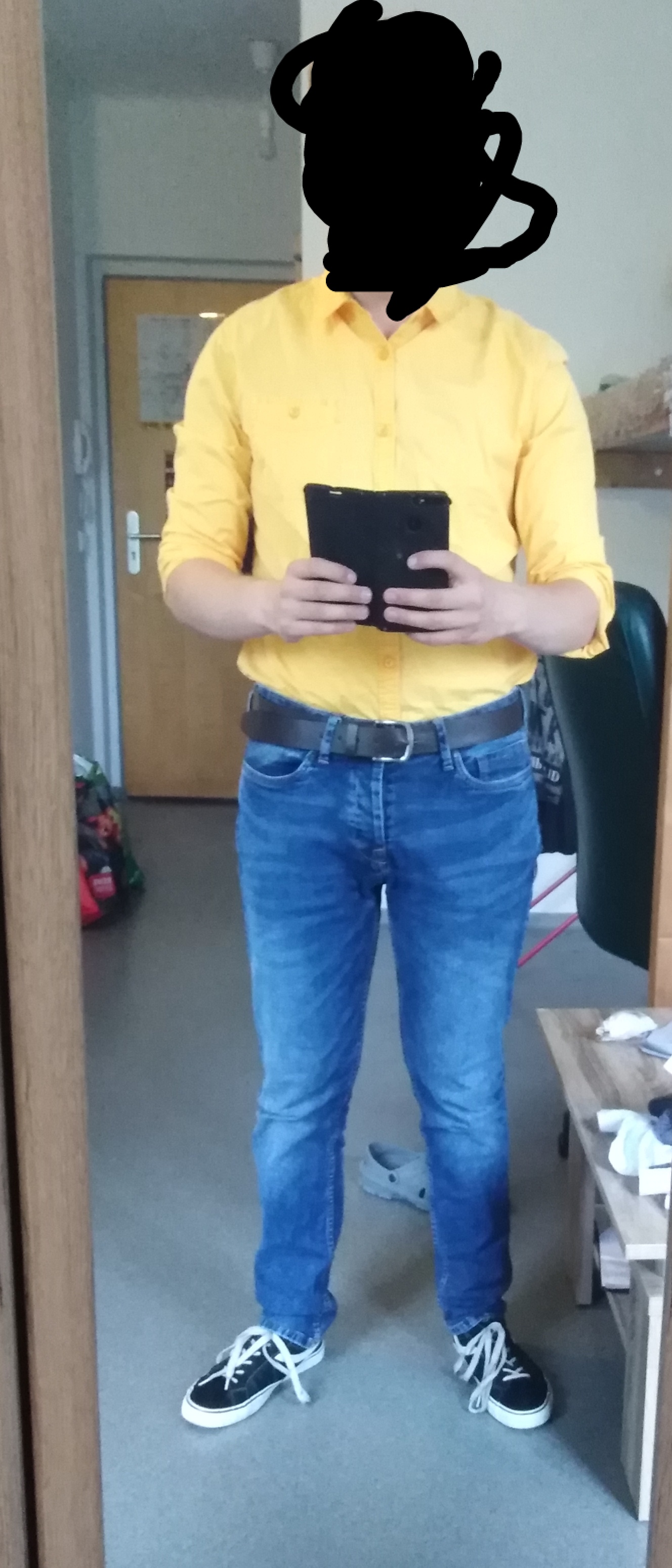 Gelbes Hemd Reingesteckt Zu Blauer Jeans Und Skaterschuhen Mode Manner Kleidung