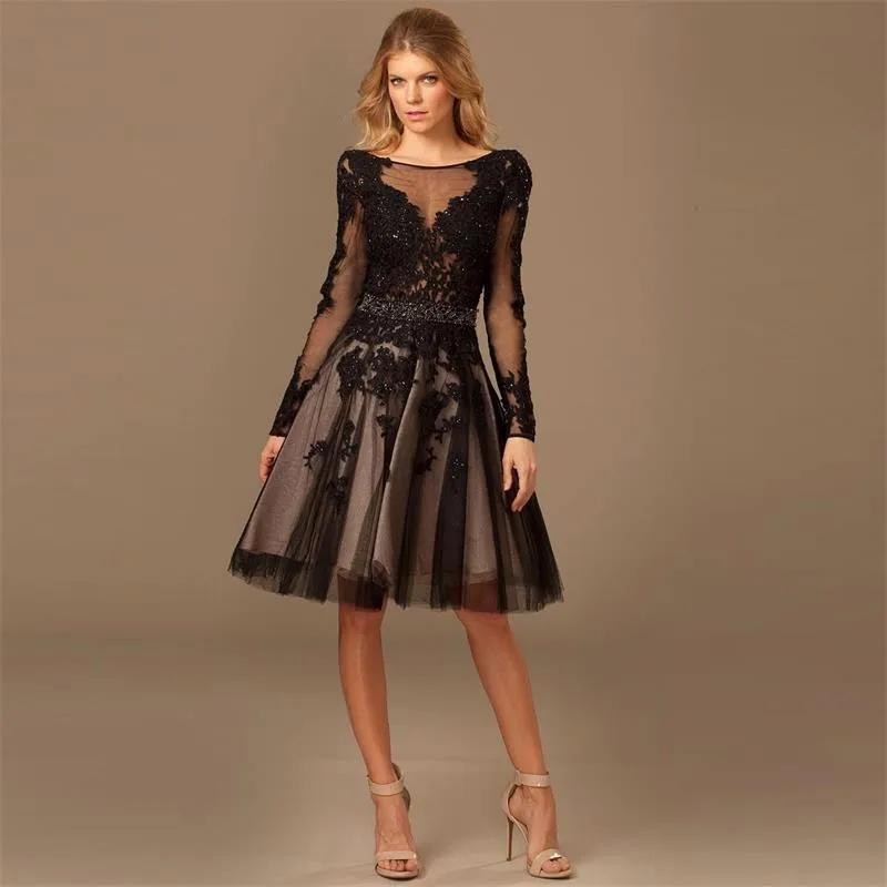Moderne Langarm Cocktailkleider Tull Spitze Abendgesellschaft Kleider Knielangen Abendkleider Schwarz Gesellschaftliche Anlasse Kleider Sleeve Cocktail Dresses Long Sleeve Cocktail Dressescocktail Dresses Aliexpress